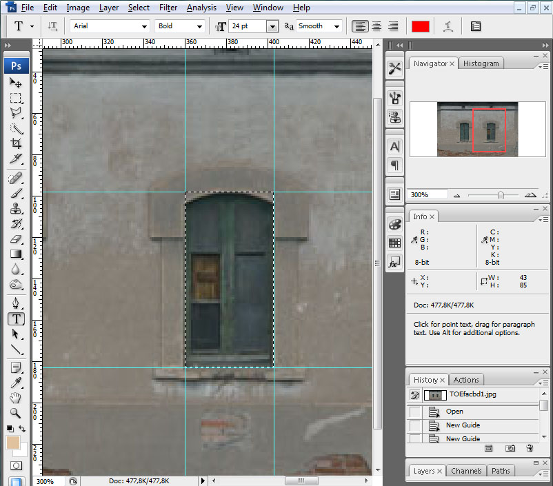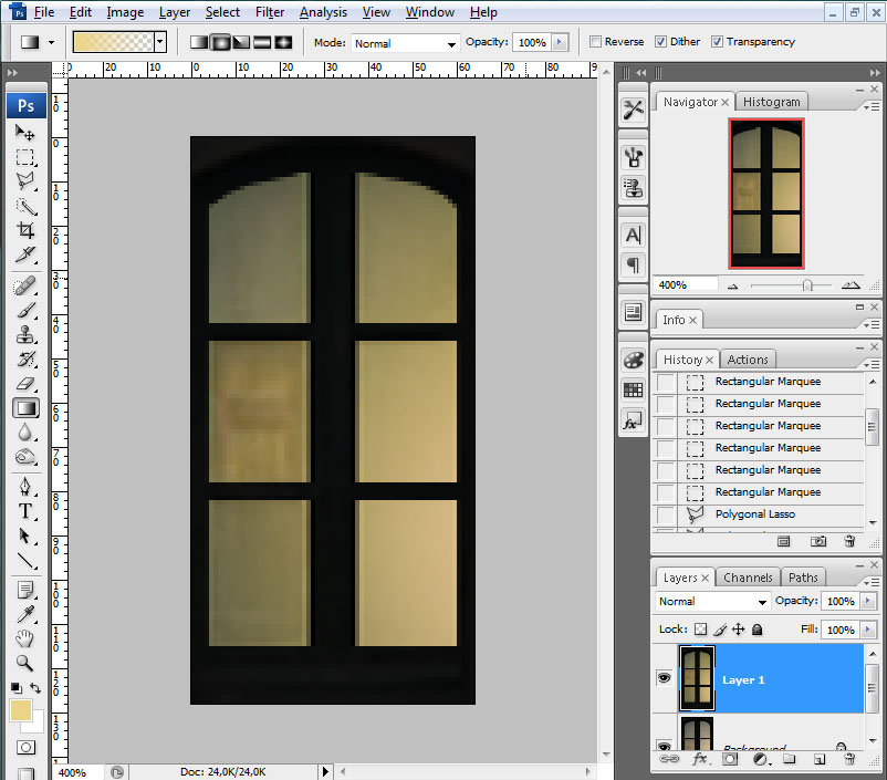 Recortaremos la ventana y crearemos una nueva imagen con ella a la que le daremos las dimensiones 128 píxeles de alto por 64 píxeles de ancho. Crearemos una selección que defina los cristales de la ventana: