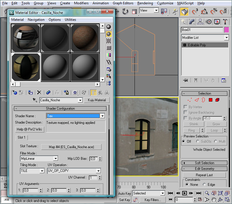 Ya tenemos los tres polígonos deseados, con sus respectivos materiales. Un último paso consistirá en seleccionar el polígono de la iluminación nocturna de la ventana (recordemos que se llama "1_0256_fx_night"), y a este elemento deberemos "atachar" los tres nuevos polígonos nocturnos, dado que al igual que en el caso de la ventana, tan sólo queremos que sean visibles por la noche, no debiéndose renderizar por el día.