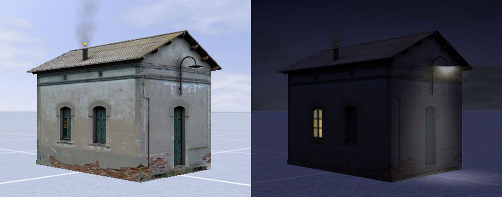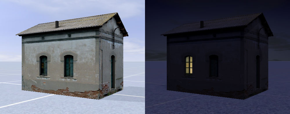 Hay que señalar que, al igual que podemos usar el nombre de nodo "fx_night" para objetos que tan sólo se visualizan por la noche, también disponemos del nombre de nodo "fx_day" que realiza la acción contraria, es decir, se visualiza únicamente durante el día. Ambos nodos son alternativos y en el preciso momento que uno se desactiva el otro se activa, por lo que combinados podemos representar con ellos elementos que tienen diferente aspecto de día o de noche.