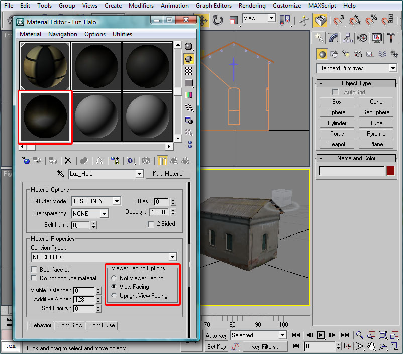 Por último con el tercer material, el que usaremos para el halo de la bombilla, actuaremos de igual forma, llamándole "Luz_Halo" y con la textura "glow_lens_nm.ace". Pero en este caso necesitamos algo más, que no es preciso en los anteriores materiales: El polígono que contenga el halo de la bombilla deberá orientarse siempre en la dirección de la cámara del simulador. O sea, se debe ver igual desde cualquier ángulo de la escena, puesto que el halo no debe parecer una superficie plana estática en el espacio, si no más bien pretendemos un efecto luminoso incorpóreo.