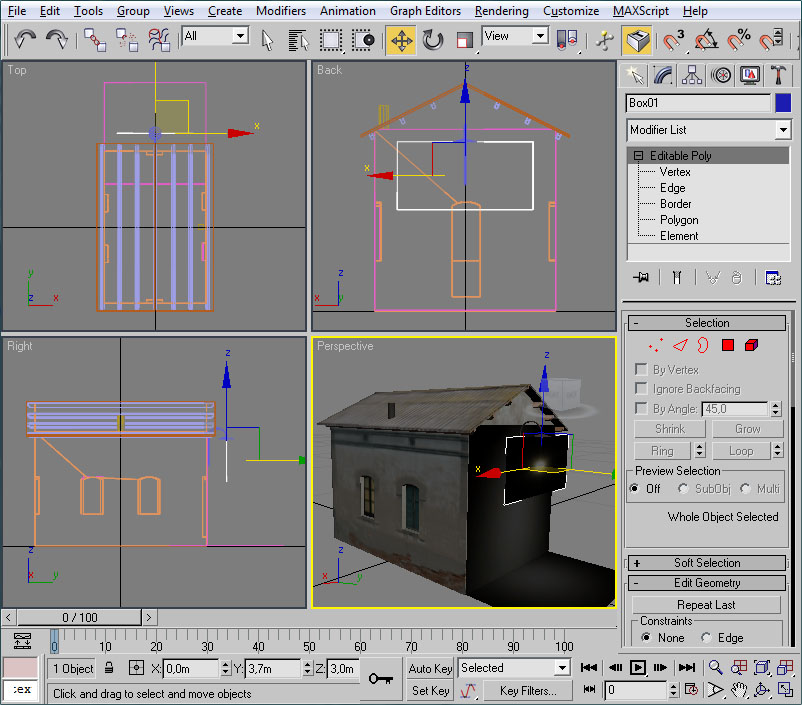 Con el mismo procedimiento crearemos un polígono para cubrir la fachada frontal del edificio. El cubo será esta vez de 4x4x4 metros, y los vértices a eliminar lo serán los "posteriores" del cubo: