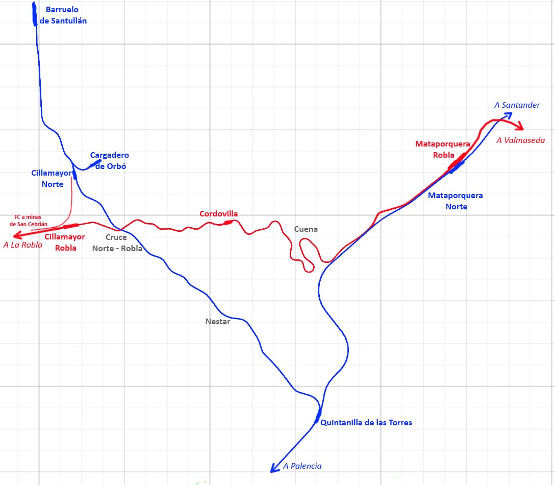 Se trata de un triángulo, formado por la el trozo de línea general de Renfe de Palencia a Santander entre Quintanilla de las Torres y Mataporquera, en leve subida, más el ramal de Quintanilla a Barruelo en rampa continua de hasta 16 milésimas y curvas normales de 300 metros. Incluye el tramos en métrica del ferrocarril de La Robla / Feve entre Cillamayor y Mataporquera por el alto de Cordovilla, a donde se sube, con curvas y contra - curvas de radios próximos a 100 metros, en dura rampa continua de 20 milésimas, para bajar en pendiente del mismo gradiente, incluyendo en el trazado el cruce a nivel con Norte de Cillamayor y las famosas revueltas de Cuena. También abarca, con cierta licencia cronológica, el cargadero de las minas de Orbó en Cillamayor y podría meterse también el tramo en métrica del antiguo ferrocarril de las Minas de San Cebrian a Cillamayor Norte. Luego en Barruelo había vías de 500 mm de las minas pero creo que eso ya será otra historia...