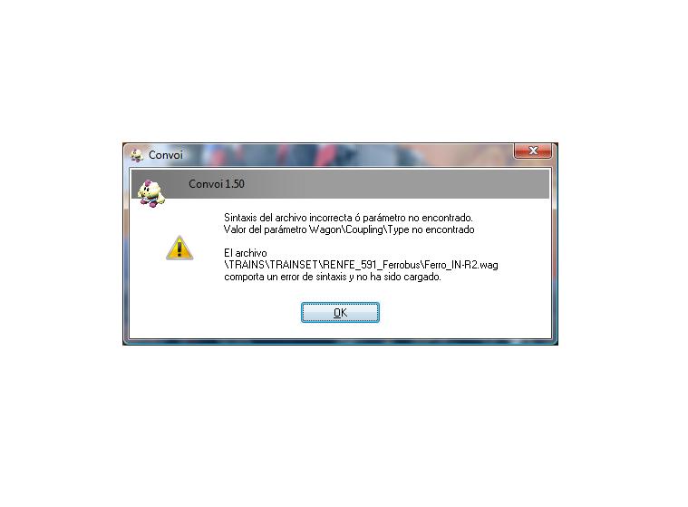 El segundo tren o sea regional 591 ferrobus v.2, el archivo wag que falla, es el de uno de los vagones. No puedo concretarte cual, pues estoy en centro publico y hasta que no vaya a mi casa no lo podria ver. El ferrobus consta de 5 o 6 archivos con y dentro de carpeta TRAINSET hay varios archivos wag de diferentes vagones del mismo. El wag que falla, esta en TRAINSET, pero juego no lo detecta. Al inicial el train simulator me sale el mensaje de error, nombre del archivo.wag no se encuentra o parecido.