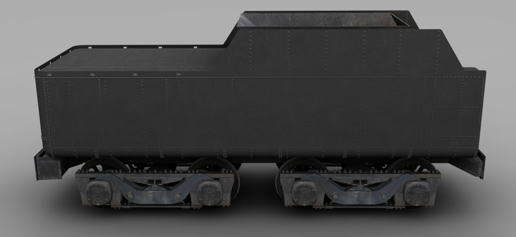 Hasta aquí un breve resumen del estado actual del trabajo. De momento hay mucho elemento provisional, y mucho (pero que mucho) trabajo pendiente por realizar. A título de ejemplo, los remaches que se observan NO irán en el modelo final (so pena de sobresaturar el simulador, porque os prometo que hay muchísimos remaches en el modelo), los he modelado tan solo porque es sencillo (haces un remache y te pasas un buen rato con recorta y pega) y porque me servirán para obtener las texturas definitivas de la caja del ténder por proyección de los mismos sobre la textura lisa inicial.