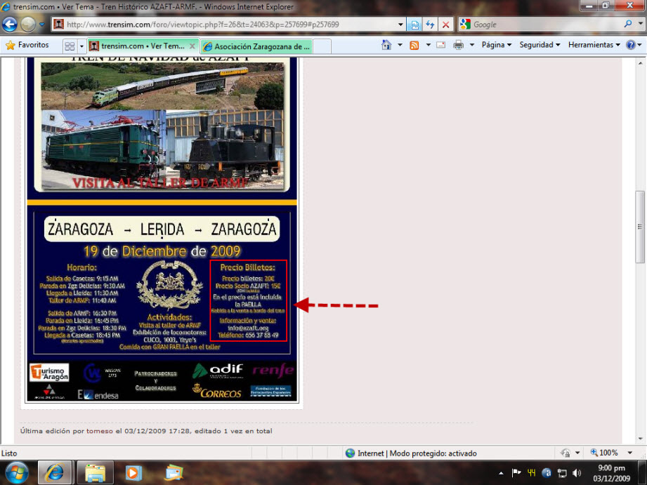 Jotas escribió:Desearía saber como me pongo en contacto con vosotros, par saber más sobre este viaje Casetas-Zgz.-Lérida el próximo 19-12-09m, precio, comida etc y donde solicitarlo.