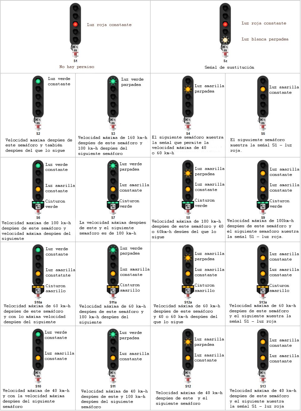 3. La senal S10 en el semaforo (verde arriba, amarillo abajo), significa que tienes que correr a 40 km/h, no 30, hasta que pases las vias y despues con la velocidad maxima.