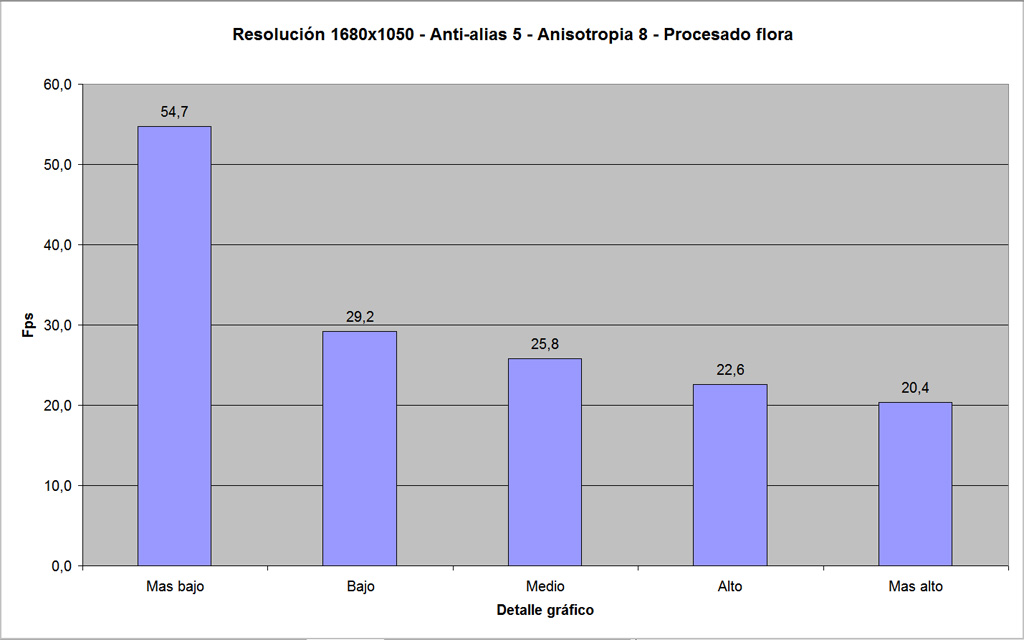 He efectuado el test que explicas en estas condiciones. Normalmente juego con fluidez en modo 'High' y a tope en el modo gráfico, pero le he subido un poco a ver que pasaba en el test. Y aquí los resultados: