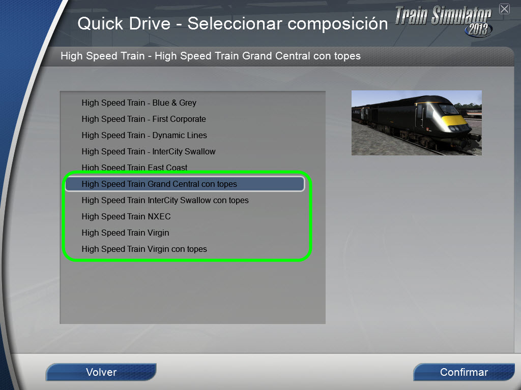 Para el Quick Drive, en el menú "Seleccionar locomotora" hay que seleccionar el "High Speed Train":