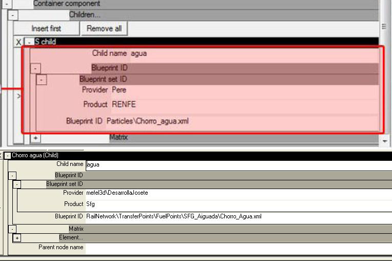 Siguiendo los pasos uno a uno, llego a visualizar por separado los dos objetos, el emisor de partículas simulando el chorro de agua y, por separado, la propia aguada, pero a la hora de renderizar el objeto aguada con su child emisor, el mensaje es siempre el mismo: Child blueprint from external set - not included in build: RailNetwork\TransferPoints\FuelPoints\Chorro_Agua.xml