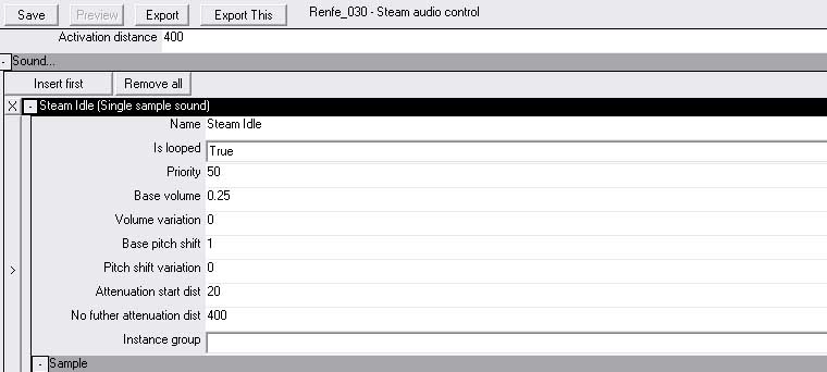 En la casilla "Attenuation start dist" se establece donde empieza a atenuarse el sonido y en la "no futher attenuation dist" donde deja de hacerlo, normalmente porque ya no se ha de oir ahí. En este ejemplo 400 es un poco excesivo pero bueno.