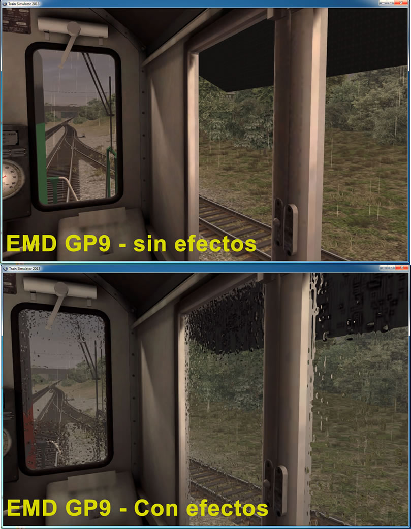 La iluminación no es complicada de poner en las locomotoras de versiones anteriores a Railworks 3/TS2012, pero poner efecto lluvia en las ventanas no resulta tan sencillo. Hay que modificar el archivo de forma *.GeoPcDx de la cabina para obtener efecto de lluvia en las ventanas. Esto es algo que solo está recomendado para usuarios muy avanzados y, en gran parte de los casos (por cuestiones de compatibidad, las cabinas parecen ser iguales pero terminan por no serlo), no llega a funcionar.