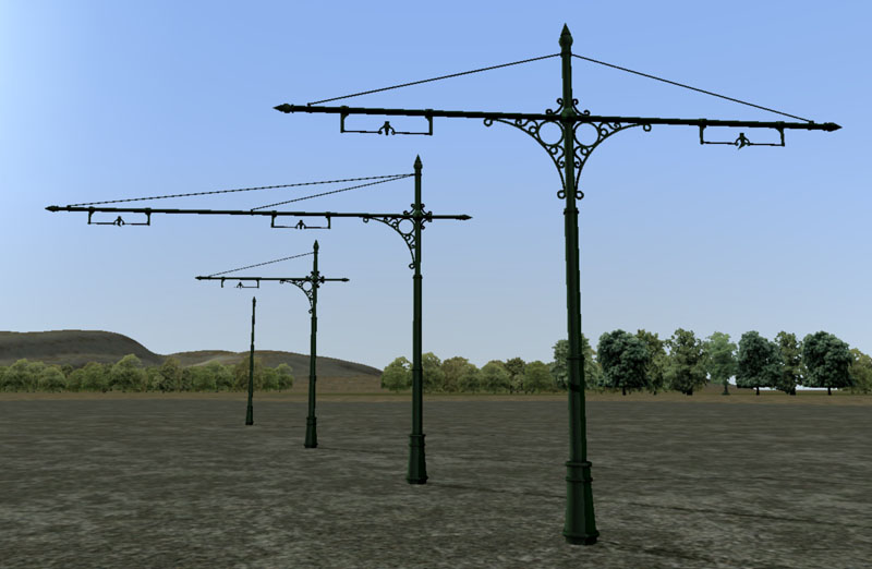 Jordi me pidió un sistema de catenaria Blackwell para su ruta, facilitando abundante información y detallados planos de la misma. Los objetos creados (mostrados en la imagen) se complementan con unos elementos procedurales para crear el juego de tensores y "hangers", que en este caso el "maestro rutero" debe colocar "laboriosamente" para reproducir el sistema de tensado de la catenaria. A juzgar por las espectaculares capturas, el resultado es excelente, pero habrá llevado sus buenas horas de esfuerzo.