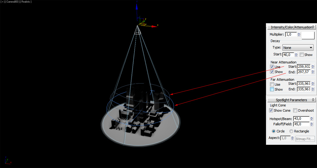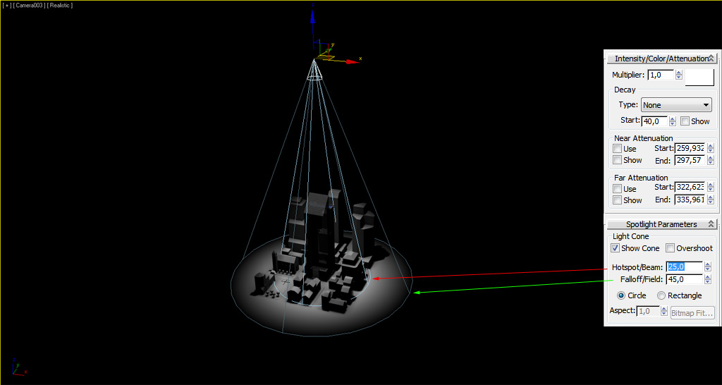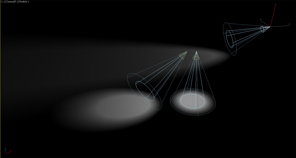 Dentro del cono interior (Inner cone), con el ángulo definido en "Hotspot/Beam" o "Theta" en Directx y RW3, la luz impacta con la máxima intensidad en la zona del círculo interior. La intensidad de la luz va decreciendo hasta llegar a 0 en el espacio delimitado por el cono exterior (Outer cone) según su ángulo definido por "Fallof/Field" o "Phi" en Directx y RW3, delimitando por el cículo exterior la zona a partir de la cual no hay luz.