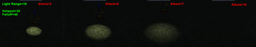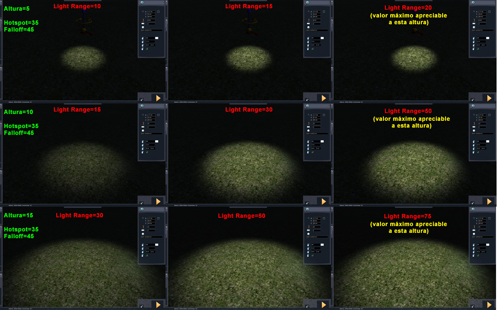 Vamos a conocer mejor los parámetros de ajuste de Altura (terreno) y Light range (intensidad) de las luces Spot: