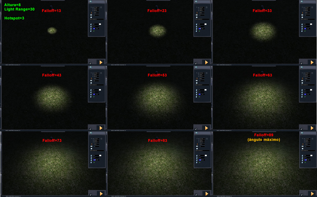 Unas imágenes para comprender el efecto en el simulador de los parámetros de las luces spot (clic para agrandar):