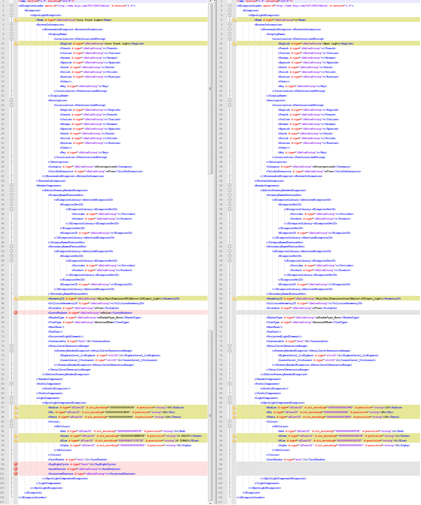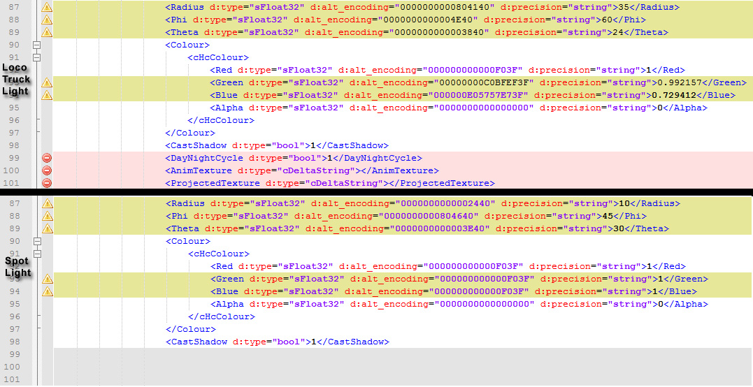 Comparativa de algunos parámetros de los ficheros xml de las luces de RW3