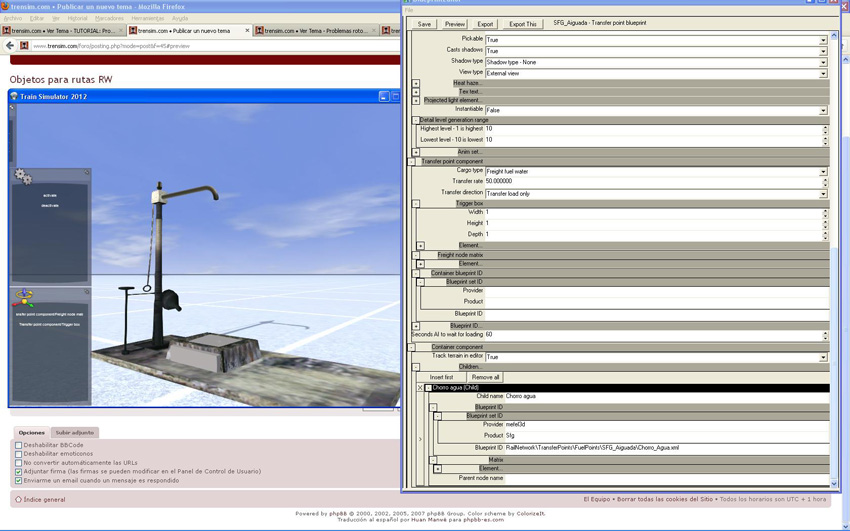 Siguiendo los pasos uno a uno, llego a visualizar por separado los dos objetos, el emisor de partículas simulando el chorro de agua y, por separado, la propia aguada, pero a la hora de renderizar el objeto aguada con su child emisor, el mensaje es siempre el mismo: Child blueprint from external set - not included in build: RailNetwork\TransferPoints\FuelPoints\Chorro_Agua.xml