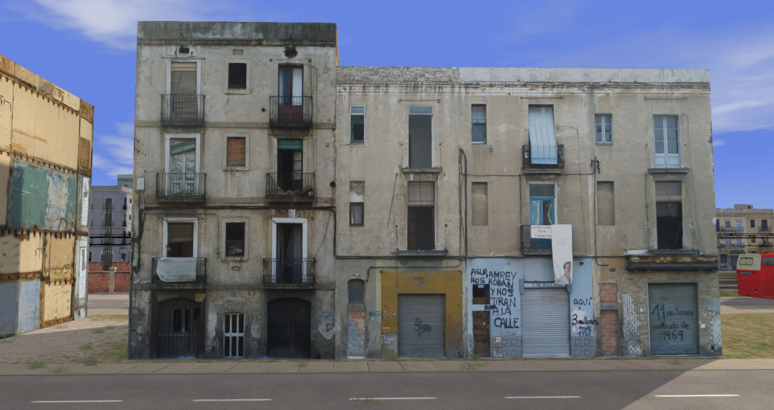 Un par de edificios suburbanos (en este montaje son el primero y el último). Las pintadas y el pésimo estado de conservación son propias del suburbio, aunque en el caso del último edificio (el del "Colmado Margarita") los vecinos se esfuerzan en mantenerlo limpio (este edificio también se puede usar perfectamente entre los edificios rurales, con los que no desentona).