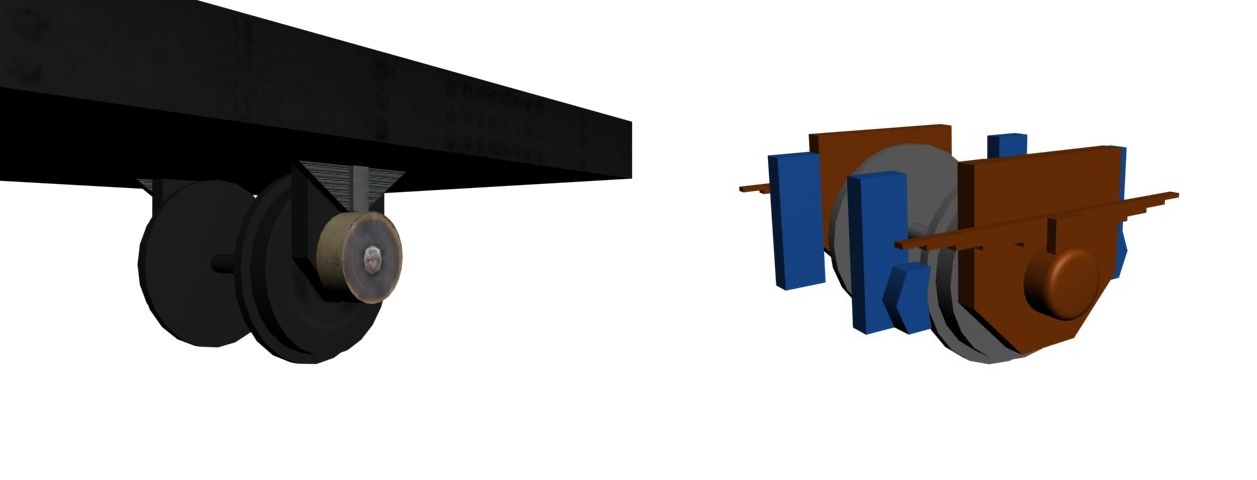 Bueno, des de esta mañana, he modelado las uniones de las ballestas al chasis, las mangueras de freno, los rieles de las puertas, los soportes de las puertas a los rieles, y el cerrojo de cada puerta. Espero que os guste, y gracias!